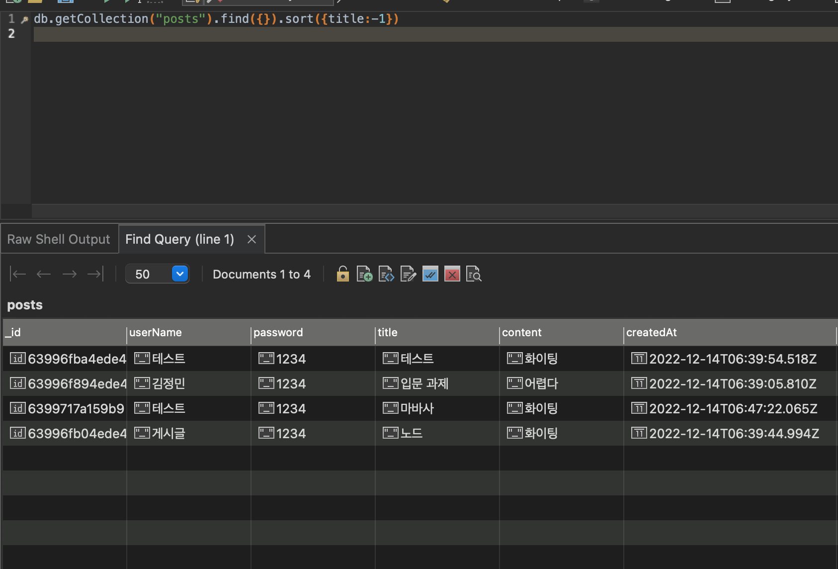 위와 같이 find() 뒤에 .sort()을 붙입니다.
