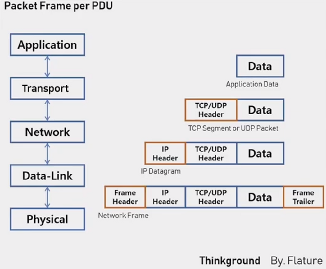 - 층별 통신 단위 = PDU = 프로토콜 데이터 유닛