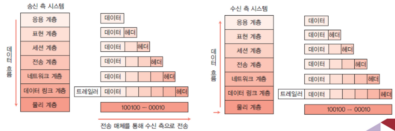 - 물리 계층과 응용 계층을 제외한 나머지 계층에서는 데이터 시작 부분과 끝 부분에 헤더나 트레일러 형태로 정보추가
