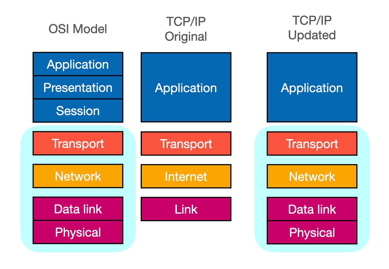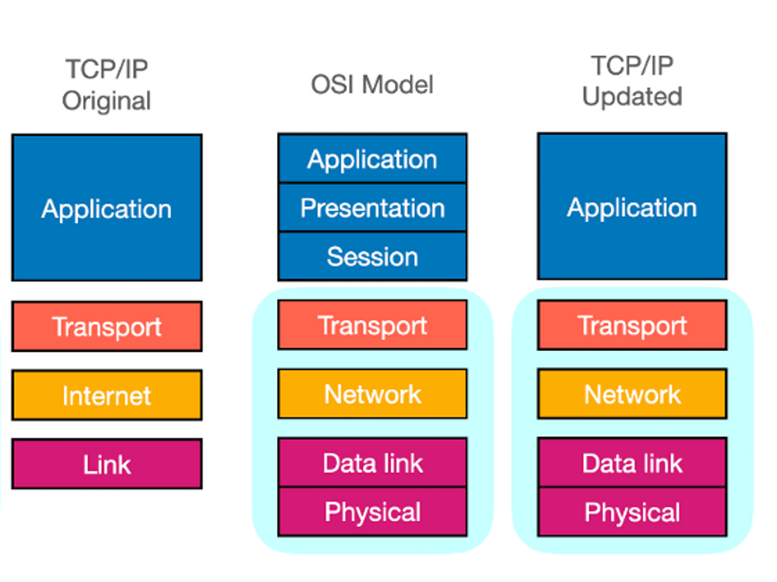 - 앞서 살펴본 역사와 같이 TCP/IP 가 먼저 나왔고, 이후에 나온 OSI Model 을 참조하여 TCP/IP 모델이 업데이트 되어 최종적으로 표준이 되었다.