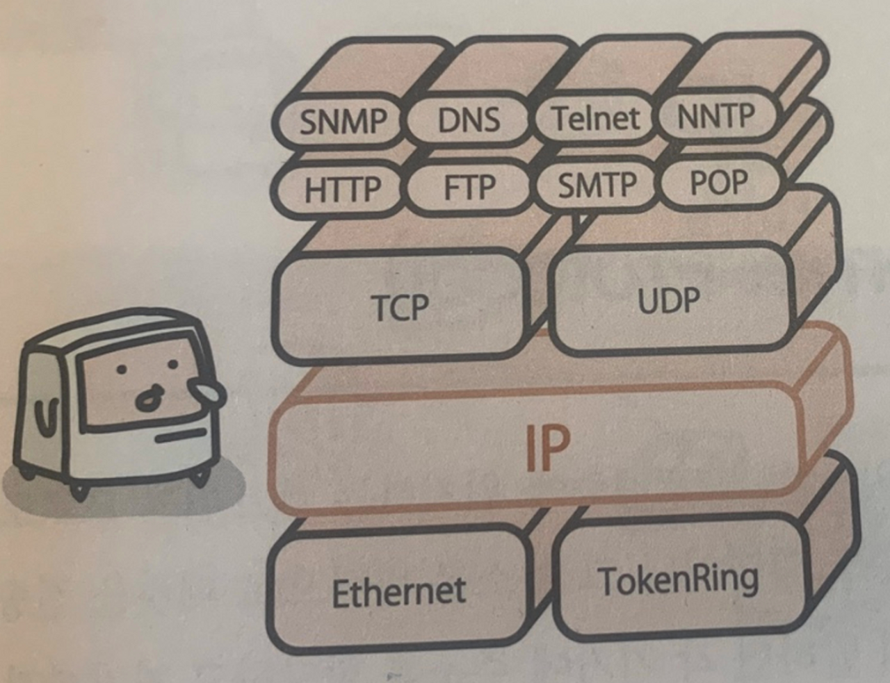 💁♂️ IP 프로토콜에 따라 네트워크를 연결하고, TCP 프로토콜에 따라 데이터를 정상적으로 전송하도록 합니다. 이 2개의 프로토콜을 중심으로 여러 프로토콜을 구성하여 만든 표준 네트워크 규칙이 TCP/IP 프로토콜 입니다.