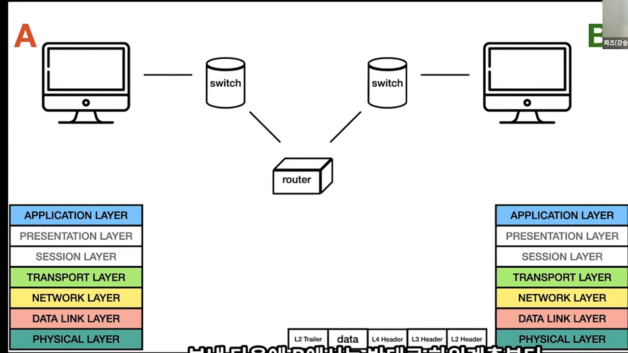 - 트레일러 : footer라고도 불립니다. 패킷의 끝에 도달했음을 수신 컴퓨터에 알리는 비트가 담겨있습니다.